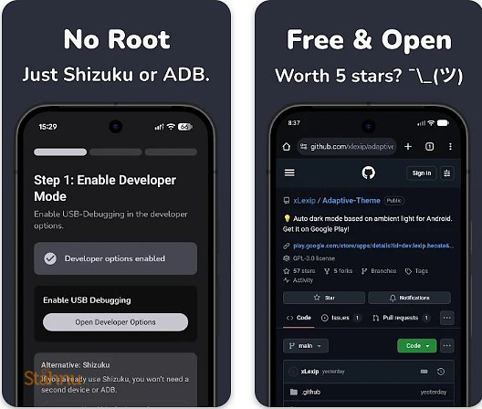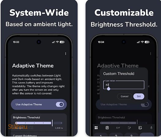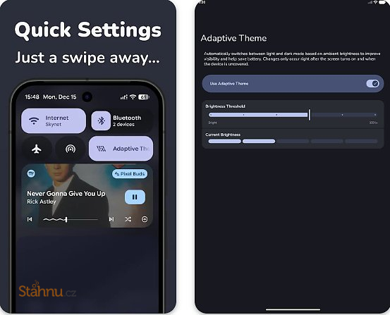 Adaptive Theme se postará o to, aby váš telefon vždy vypadal přesně tak, jak má. Aplikace sleduje světelné podmínky ve vašem okolí a podle nich automaticky přepíná mezi světlým a tmavým režimem. Ráno na slunci budete mít jasný a čitelný displej, večer zase tmavé rozhraní, které nezatěžuje oči.
